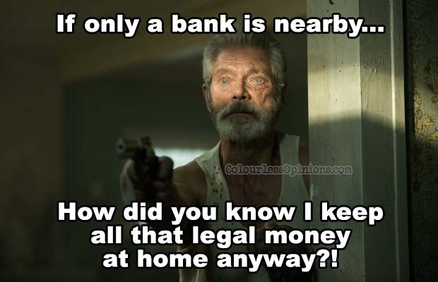 Oh, and the other two burglars who are with her? Who gives a shit? They aren’t given hardly any backstory, we don’t know their dreams or aspirations. Hell, the villain is more developed than those other two. They just make him a bit insane, even though there was better potential for a character like this. Just making him blind due to his experience with war, and emotionally devastated because his daughter was killed, that should be enough to make him someone angry at the world and angry at burglars. It would allow for some interesting discussions on the theme of willing to destroy someone’s life, in this case a life that is already destroyed, for the sake of improving yours.