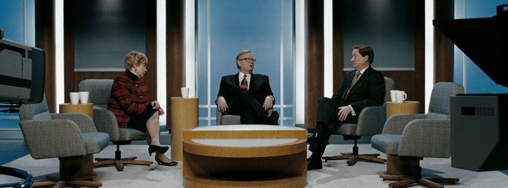 On that note, we also get our first alteration soon after this when the detectives show up to investigate the crime scene. In the comic, one of the detectives finds a picture of The Comedian shaking hands with Vice President Ford. In the film, he is shaking hands with President Nixon. It’s one of those changes that makes me ask, “Why?” Why would you change that? What purpose does it serve? Because Nixon is more recognizable? This leaves out some of the fun with regard to the alternate history this film has (the alternate timeline basically begins in 1938, maybe 1939 if we wanted to push it). Ford became president after Nixon was forced to retire in reality, so naturally he is Vice President in this alternate history. A subtle way of indicating this, and it becomes more apparent later on. Plus it raises questions as to what kind of a man Ford and/or the Comedian is for them to shake hands with one another, as opposed to what kind of a man Nixon and/or the Comedian is.
