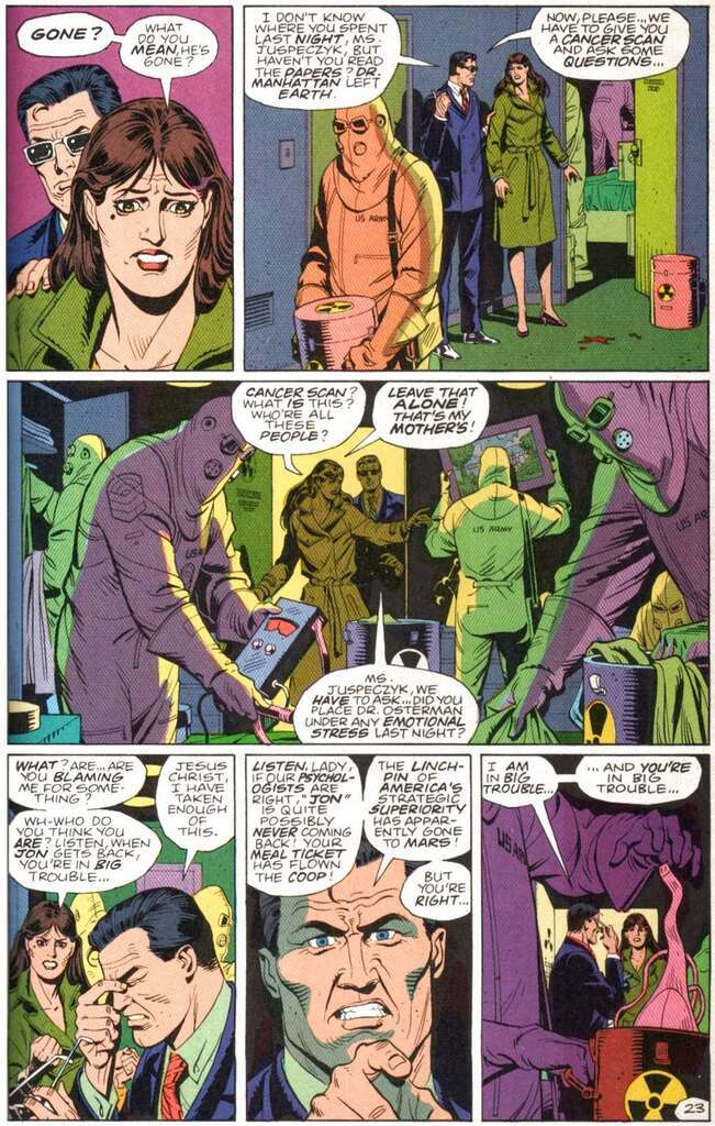 There’s nothing more terrifying than fear of the unknown, especially during the 80s when alien invasions were more of the hip and scary thing than terrorist bombings (unlike, say, anything post 9/11). Which is why it is more likely for an invasion of unknown squid monsters to drive people into uniting against a common foe than Dr. Manhattan bombs. Precisely because everyone knows that Dr. Manhattan is a creation of man-made technology. Which makes him not only something more familiar, but something scientists are capable of replicating. Like how a man-made disease is likely to have a cure developed for it sooner or later. Which makes the Manhattan bombs less likely to work, especially when Manhattan hasn’t exactly given some sort of message (or a frame-up message) to indicate why he made these bombs. I mean, if a guy like him is to be made the fall-guy, you would think there would be something along the lines of, “I’m bombing you because of this, so don’t try to do that or else.”
