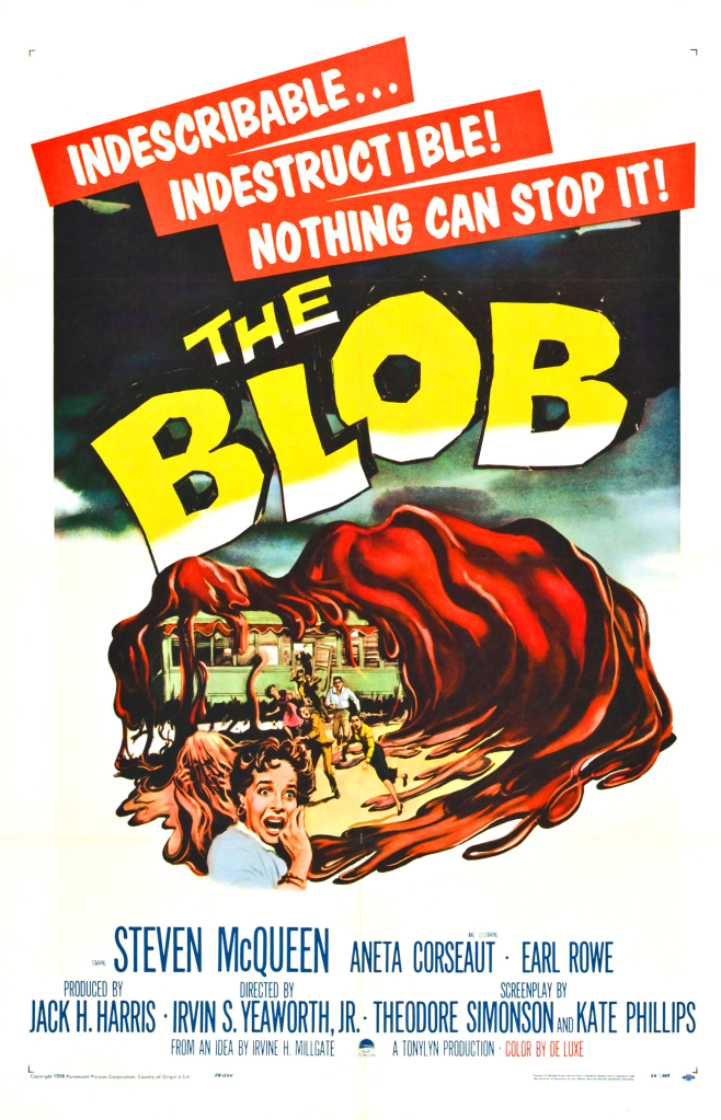 One of the few films that kinda made me afraid to go to sleep. The whole concept of a slime substance that’s able to move through vents and cracks. If they were to do a remake of this (which last I heard Samuel L. Jackson and Halle Barry starring in it, and that it was meant to be more of a scientific Michael Crichton-like procedural thriller than a horror film, with a CG blob of course), I would expect them to capitalize on this fear and have the blob get someone while they’re sleeping in a bed. They didn’t do that in the 80s version, but one can hope (or fear). The poster ends up being more disturbing than the film, with images of the blob covering a few people, and a girl. The 80s remake would capitalize on that image though, so much so that it would be the main poster.