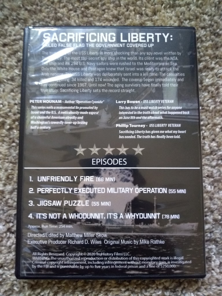 Currently an entry for this doesn’t exist on IMDB, which is saying a lot considering Europa: The Last Battle has an entry on that site (a less-professionally-made documentary that I’ve begun to find to be more flawed and misinformed the more I look into it, though it does still contain enough valid information to warrant another perspective regarding Nazi Germany and WWII; in other words, Sacrificing Liberty is better). Hopefully that will change at some point. I don’t recall who got word of this 4-part docu-series to me, someone on some social media site with some post mentioning it (I think it was on gab or something). But in any case, I had heard about the incident regarding the attack on the U.S.S. Liberty (which took place June 8, 1967), and only really knew that Israel did the attack, and that a torpedo hit the ship, some 20-30 U.S. crewman died, and there was an attempted cover-up. To this day, not many know about it, or even why. This documentary seeks to inform viewers about that incident.
