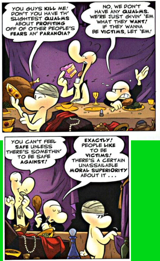 Plus, this story had one moment of exposition genius in it. A life lesson that is relevant to today, with regard to society. A brief segment where they talk about the moral superiority complex one gains from victimhood mentality.