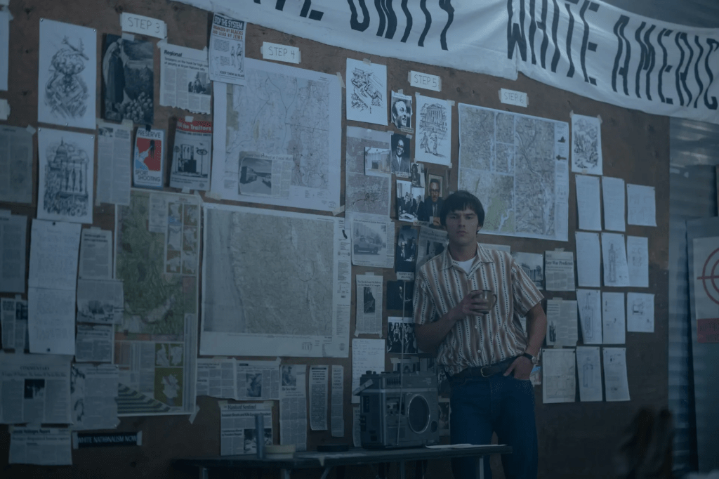 Now don’t get me wrong, the film didn’t make this up, this actually happened. There was an actual white supremacist group that actually did these robberies, bombings, and killing of the radio host. There’s no getting around that. But when the epilogue text at the end of the film states that this book called The Turner Diaries (you won’t find this on Amazon or Barnes & Noble, or even Archive.org, you’re going to have to go to the CosmotheistChurch for something like that) which is a direct influence upon these people that caused them to do these acts, and is also responsible for other more recent white supremacist events such as the January 6 incident at the U.S. capitol. Now… you see… the moment it brought that bullshit up, it makes be unable to take anything from this film at face-value. Anyone with a brain in their skull should know by now that the official account of January 6 is more bullshit than the official account of 9/11 and the JFK assassination. That epilogue made the whole thing end on a sour note for me, making me shout, “Of fuck you! Kiss my ass!” Not exactly the last note a film would want to hit with a viewer.